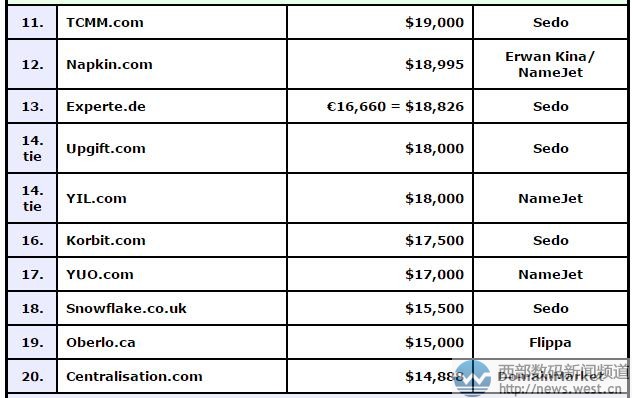 除了三字母、四数字域名以外,英文域名Screensaver.com(屏幕保护)、Leah.com(人名,利亚)和Apologize.com(抱歉)均榜上有名,成交价均在19,000美元以上。这些域名含义清晰,比较通用,应用价值都不错。