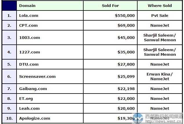 西部数码(west.cn)6月8日消息,本期的DN交易榜(5.22-6.4)上,短域名占据了绝大多数席位,其中卖价最贵的域名是lola.com,成交价为550,000美元,约合人民币374万元。