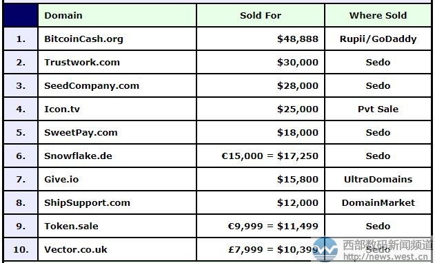 据whois信息显示,域名bitcoincash.org于今年3月份手工注册,虽然注册时间很短,但由于其“比特币现金”的含义迎合了今年上半年高歌猛进的虚拟货币尤其是比特币的发展,所以这类域名的市场价值随着水涨船高,bitcoincash.org能卖出33万元的价格也是情理之中。 随后是以30,000美元在sedo平台成交的域名trustwork.com,约合人民币20万元,有“信任工作”的意思。目前对应新西兰云管理软件trustworks.co.nz、全球性环保企业trustworksglobal等。而购买域名trustwork.com的是一家新兴科技发展企业Trustwork。 紧随其后的是以28,000美元结拍的英文组合域名seedcompany.com,约合人民币19万元。该域名直译为“种子公司”,对应有服饰品牌Seed Heritage、机动战士高达SEED动画以及一款名为seed的社交阅读应用。该域名尽管目前尚未启用,不过whois显示已经绑定至服务器了,不久将建站上线。 本期榜单的第五名则是私下成交的icon.tv,成交价为25,000美元,约合人民币16.9万元。Icon是“偶像、崇拜”的意思,.tv原是太平洋岛国图瓦卢的国家域名,后多用在视频、直播类领域。组合在一起,域名icon.tv很适合搭建偶像直播平台。 本期榜单排名前10的域名中,国别域名还有德国域名snowflake.de(雪花),成交价为15,000美元,约合人民币11.5万元;英属印度洋领地域名give.io(给予),成交价为15,800美元,约合人民币10万元;以及英国国家域名vector.co.uk(矢量、航向)也以五位数美元成交。 除此以外,本期一枚新顶级域名token.sale也以11,499美元的价格跻身前10,约合人民币8万元。token.sale有“代币销售”的意思,很适合搭建虚拟货币电商类平台。另外,其他域名也有不错表现,交易详见下图: 本文转载自新闻资讯,原文链接:DN榜:比特币风头太盛!3月注册的域名bitcoincash.org卖出 6位数!